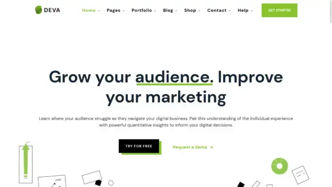 Deva, birçok açılış sayfası şablonuna sahip bir WordPress pazarlama temasıdır.